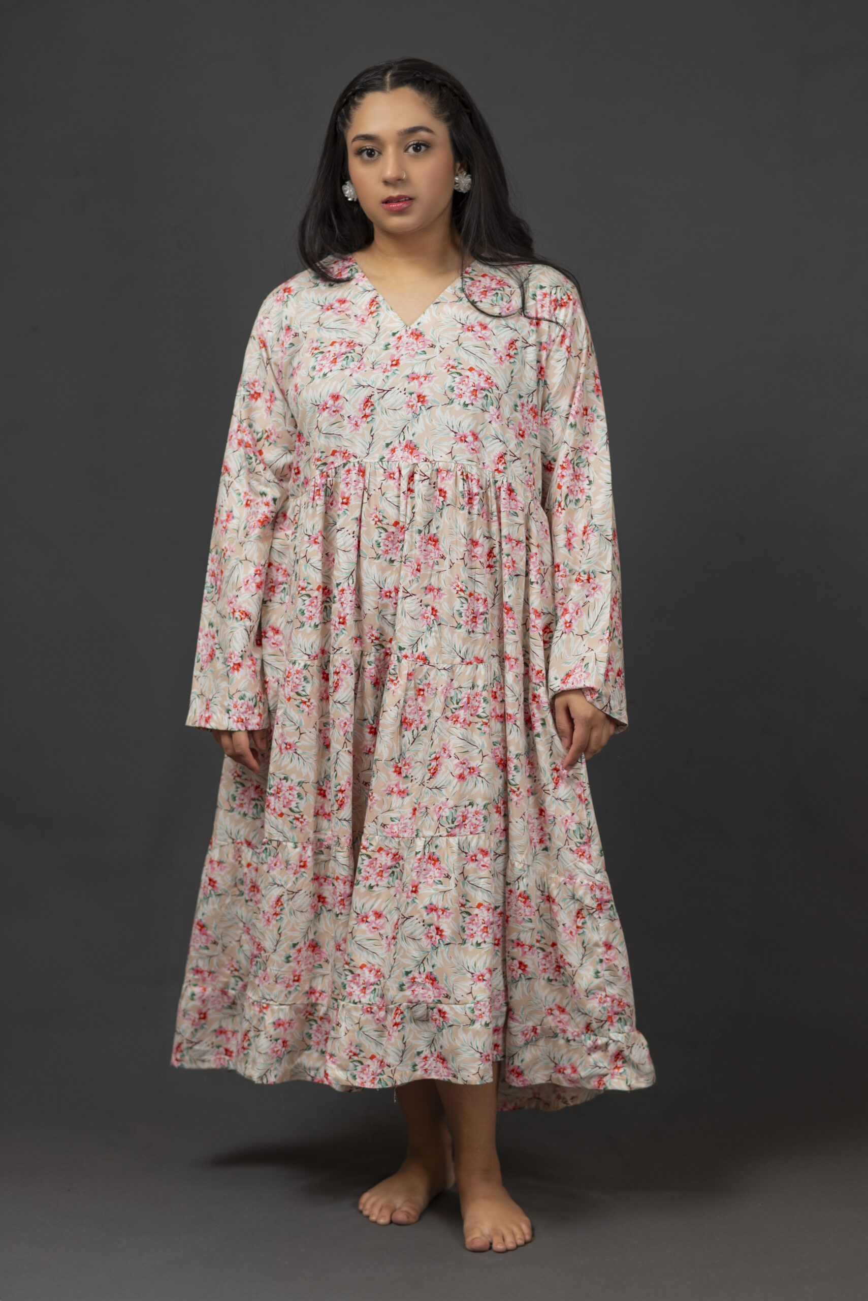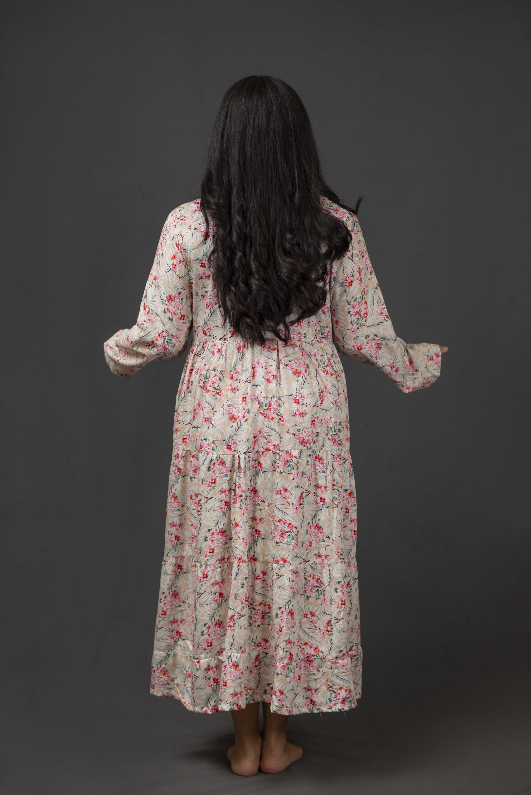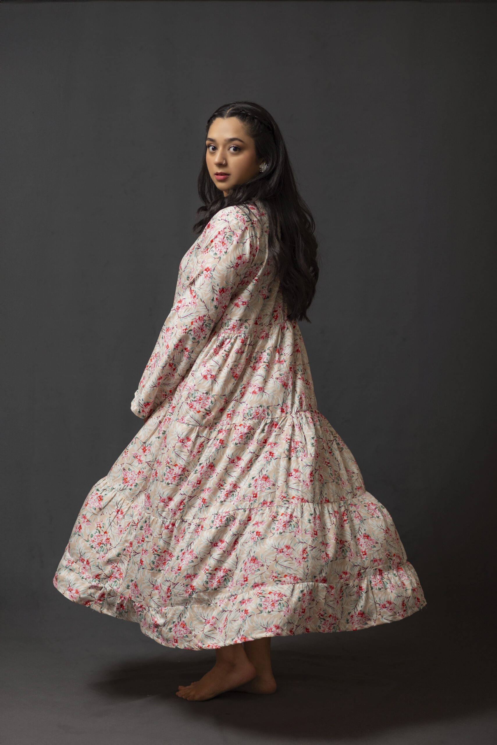 A white long dress with flares, crafted from soft linen and adorned with a beautiful floral print. This versatile dress is perfect for all ages, whether young or old, and adds a touch of elegance to any wardrobe. Its fresh and vibrant design ensures you’ll look effortlessly stylish for any occasion.