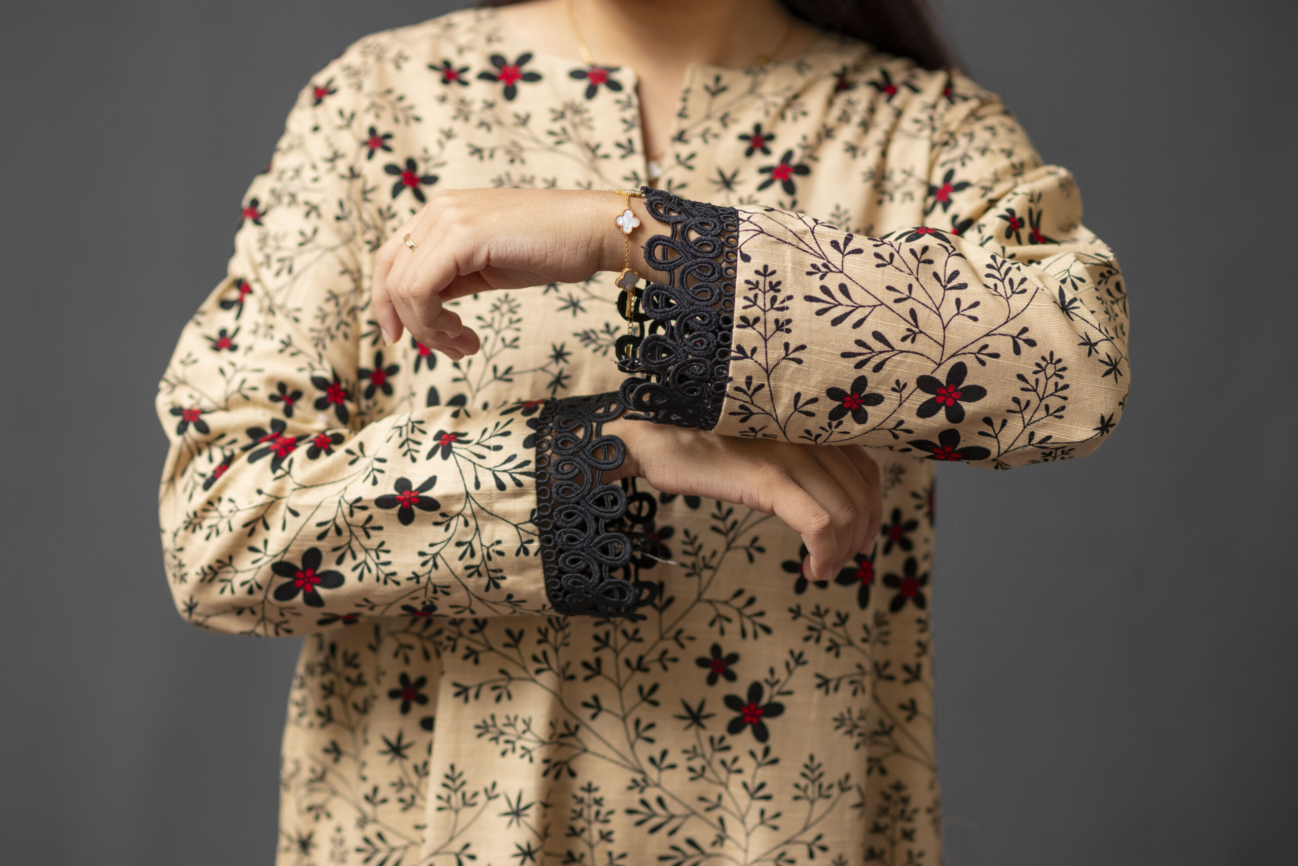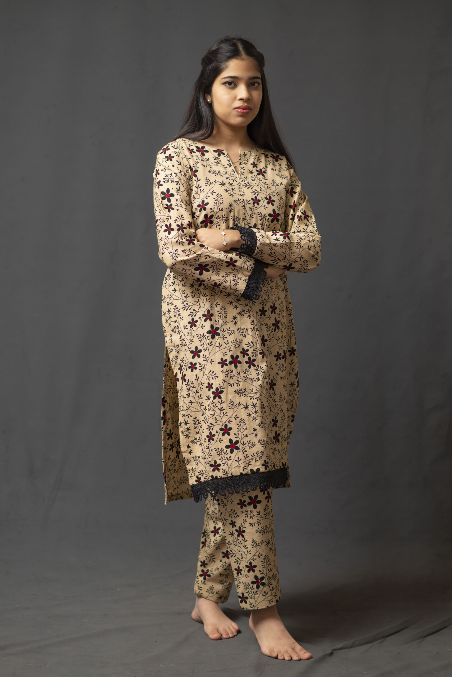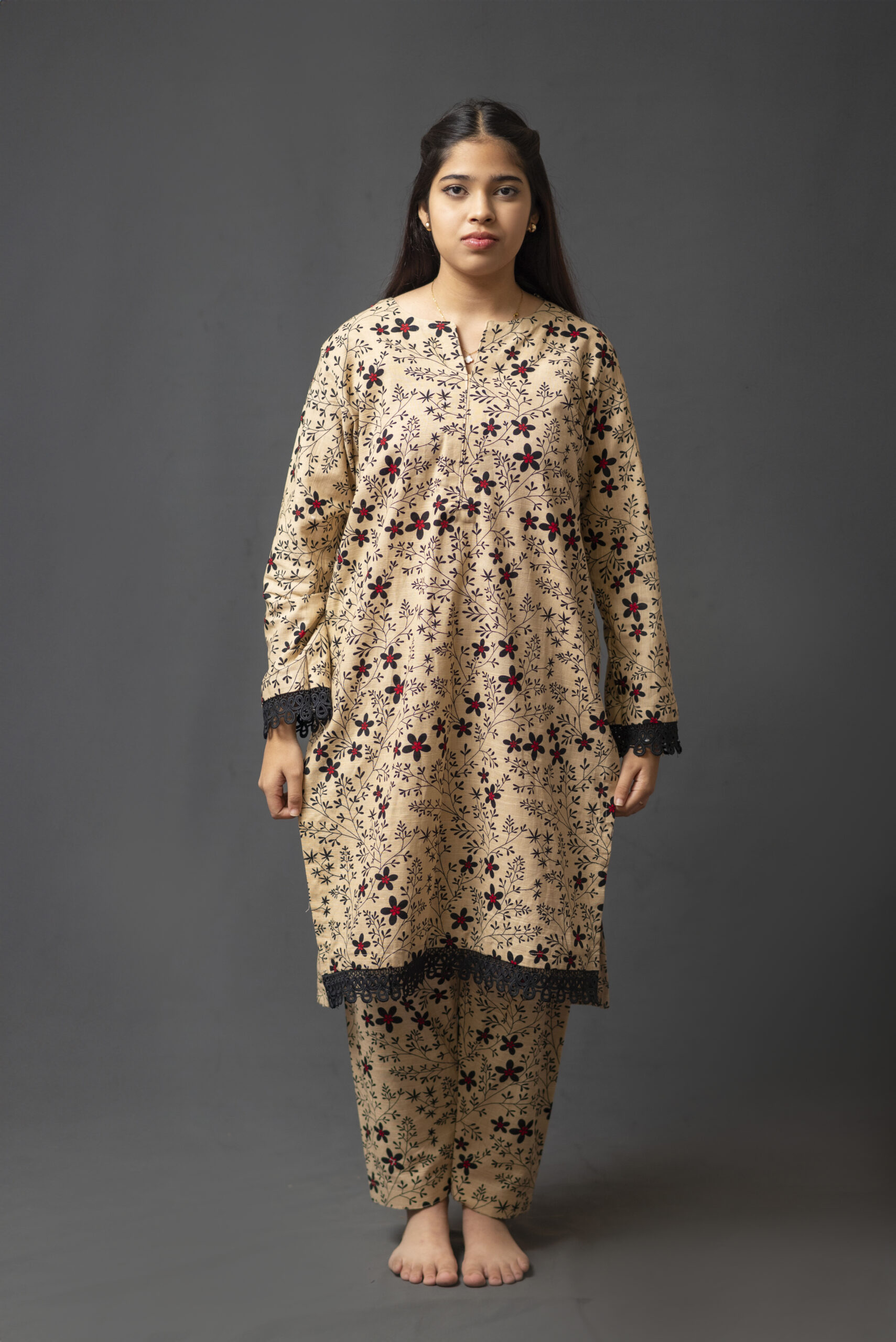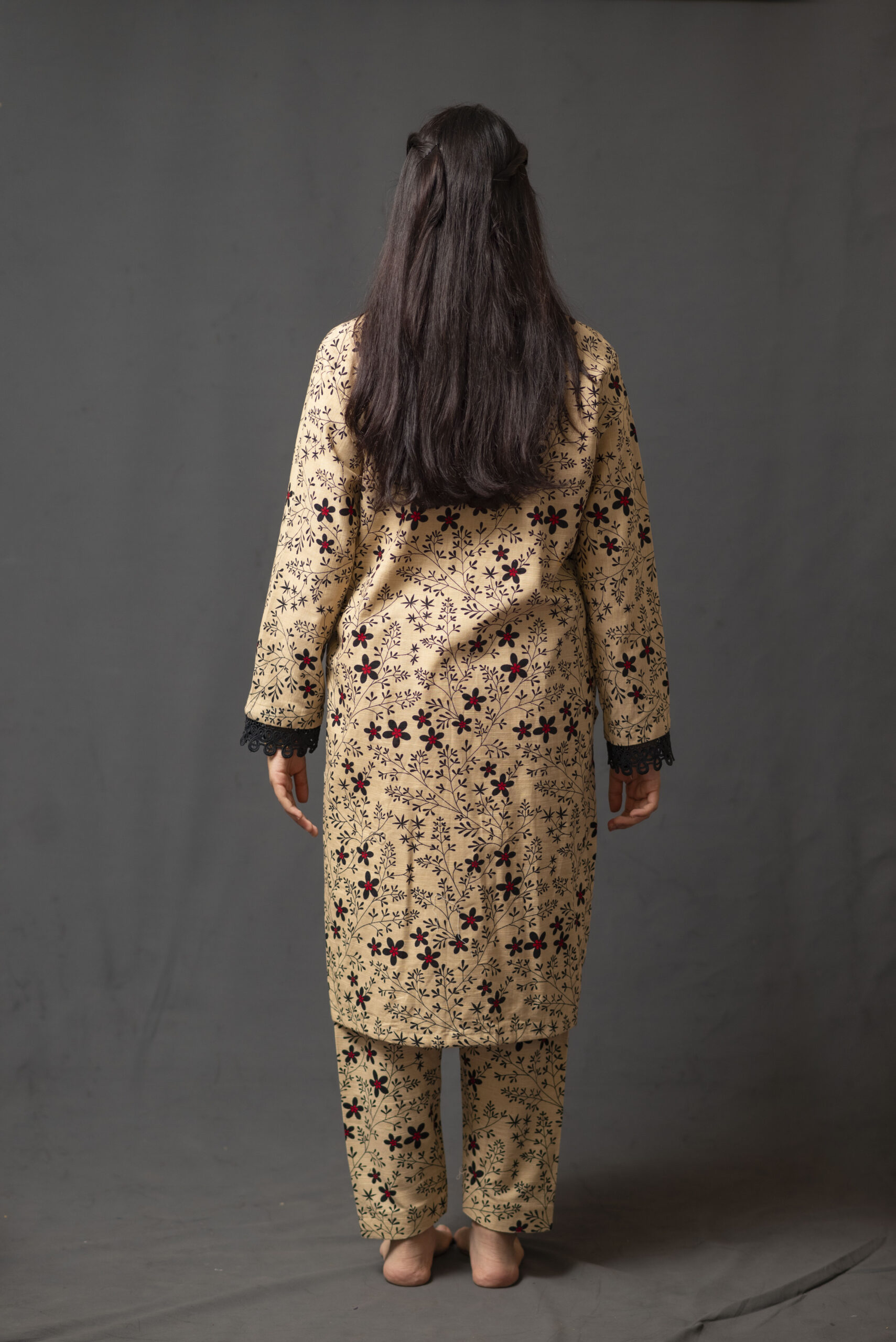 A khaddar printed shirt and shalwar, perfect for casual wear, adorned with a beautiful black lace.